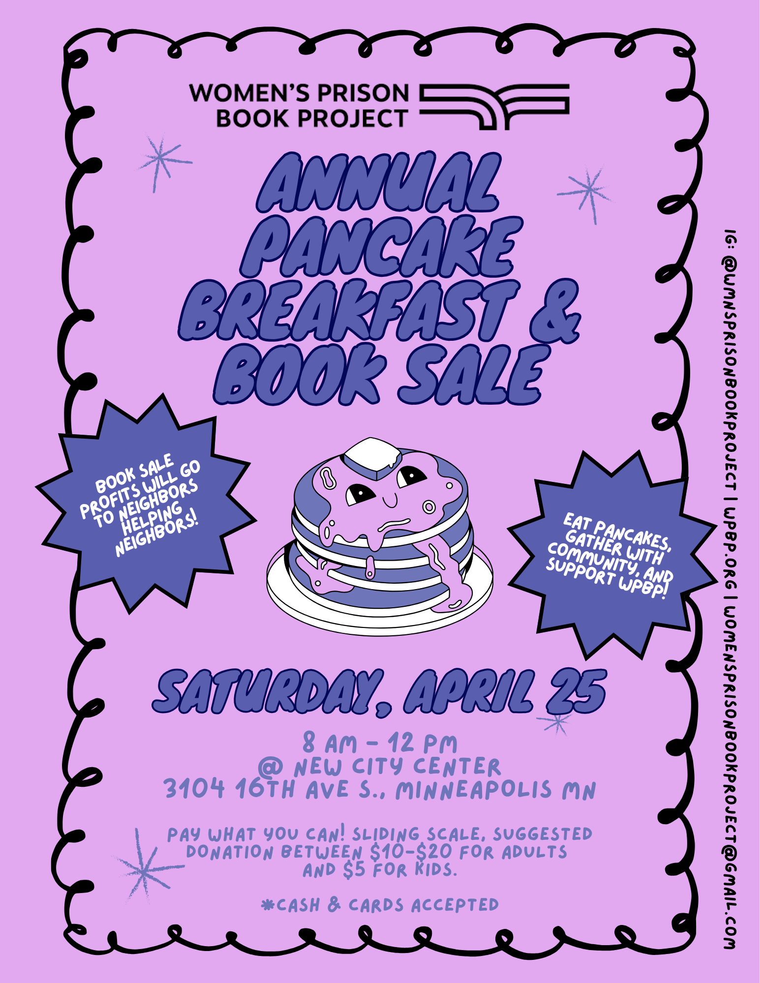 Mark your calendars for Saturday, April 25, for our annual pancake breakfast and book sale. Eat pancakes, gather with neighbors, and make sure that people incarcerated in Minnesota and across the country can continue to receive vital books and resources that they request.